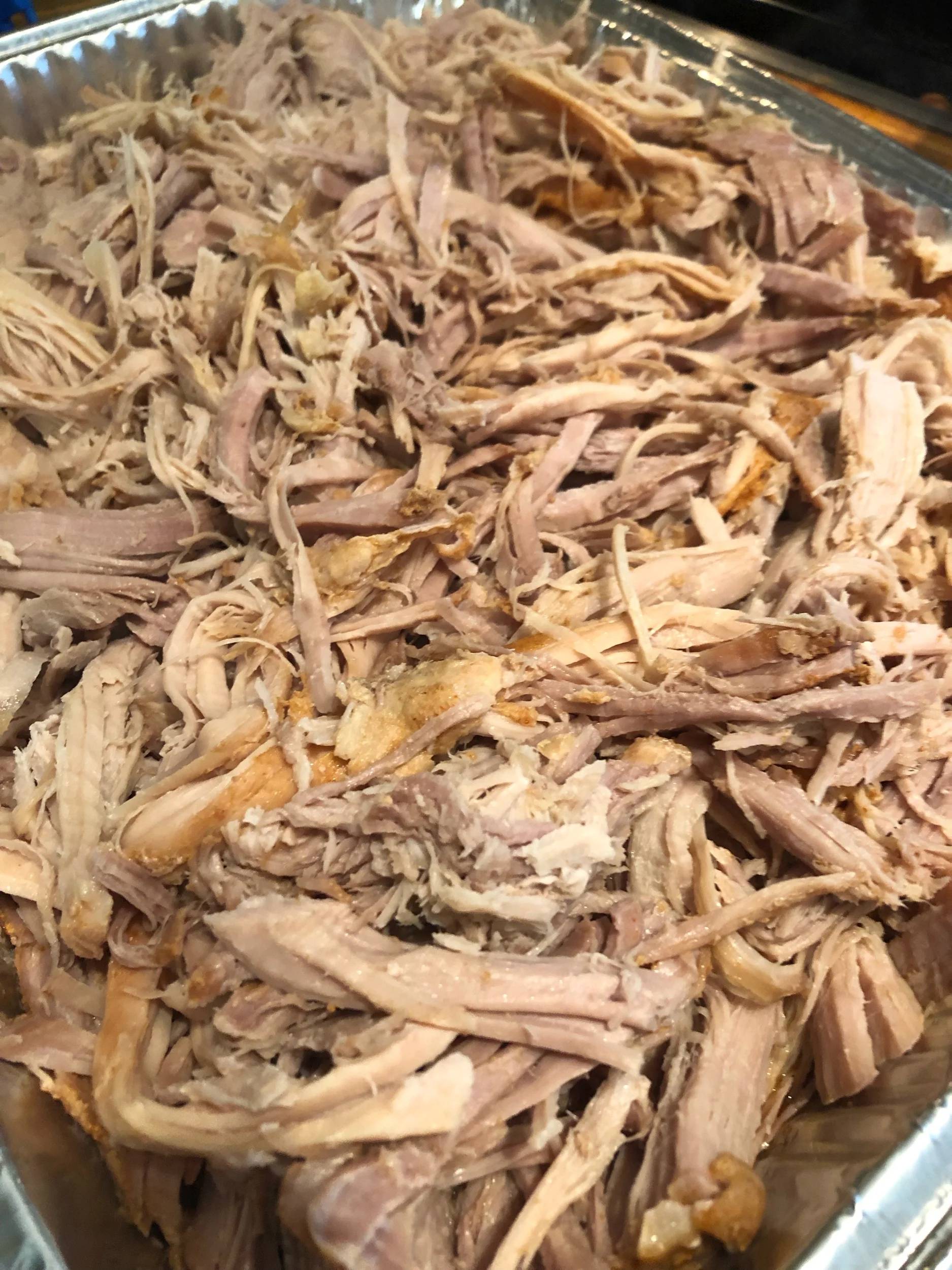First I bought four pork roasts from Costco for $15.81. I thawed these after taking them out of my freezer. I made a rub of my favorite trifecta, garlic powder, onion powder and smoked paprika and added in a bit of brown sugar and some mild Cajun seasoning. I braised all four of them in butter in my cast iron skillet, wrapped them in foil and put them in my electric smoker for about 5 hours at 250 degrees. The meat just shredded with a fork and filled two aluminum foil casserole pans.